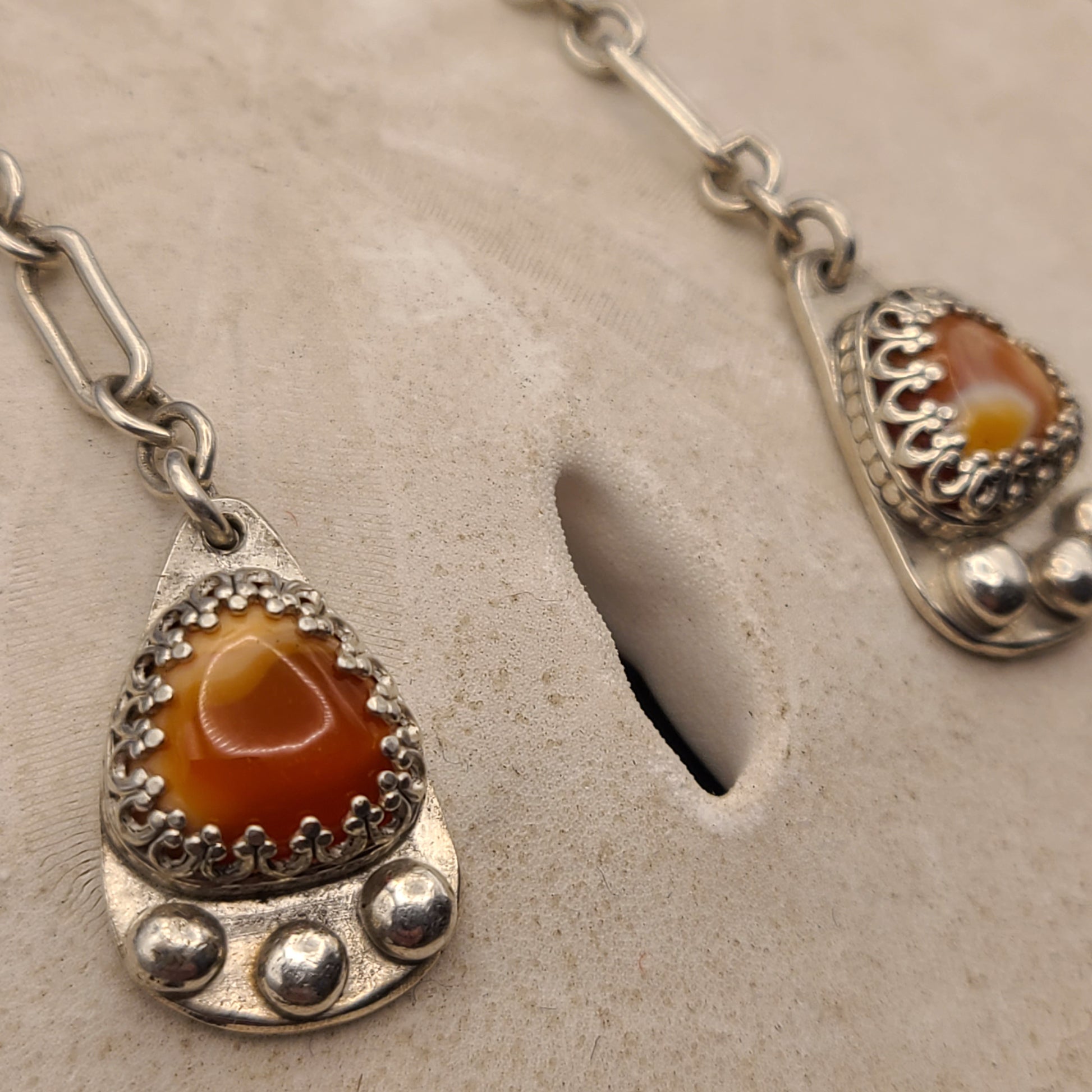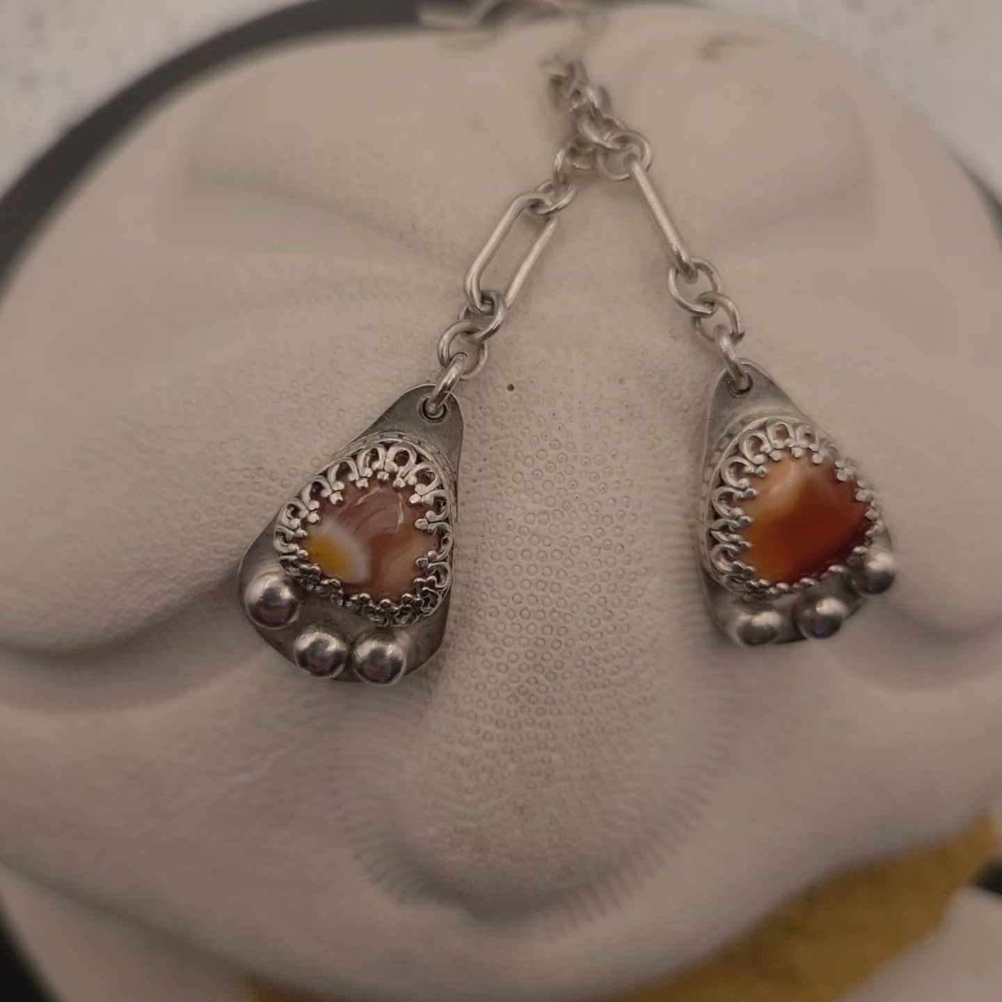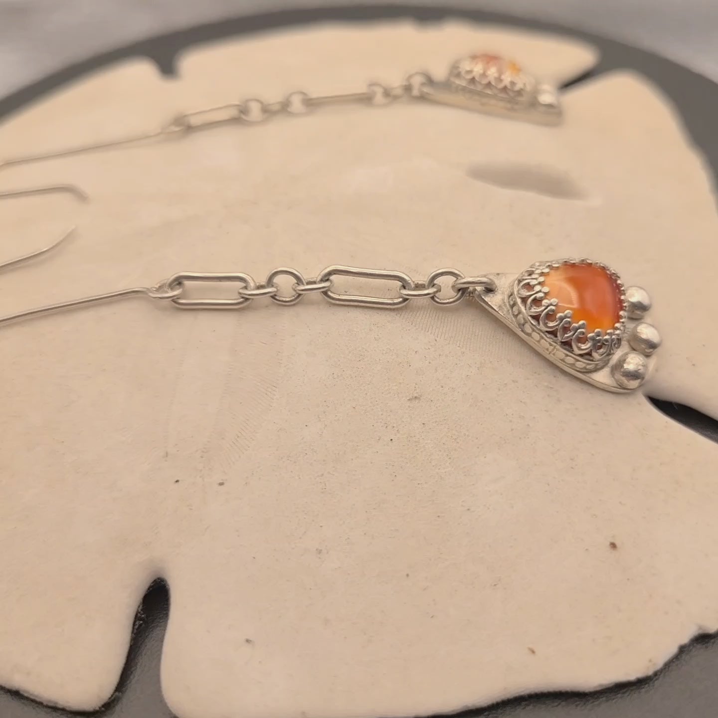 These earrings feature interesting opals that are a mix of fire opal and common opal from the La Trinidad mines near Querétaro, Mexico. I spend part of the year in Central Mexico and aquire stones from local miners and lapidary artists in that area.