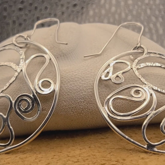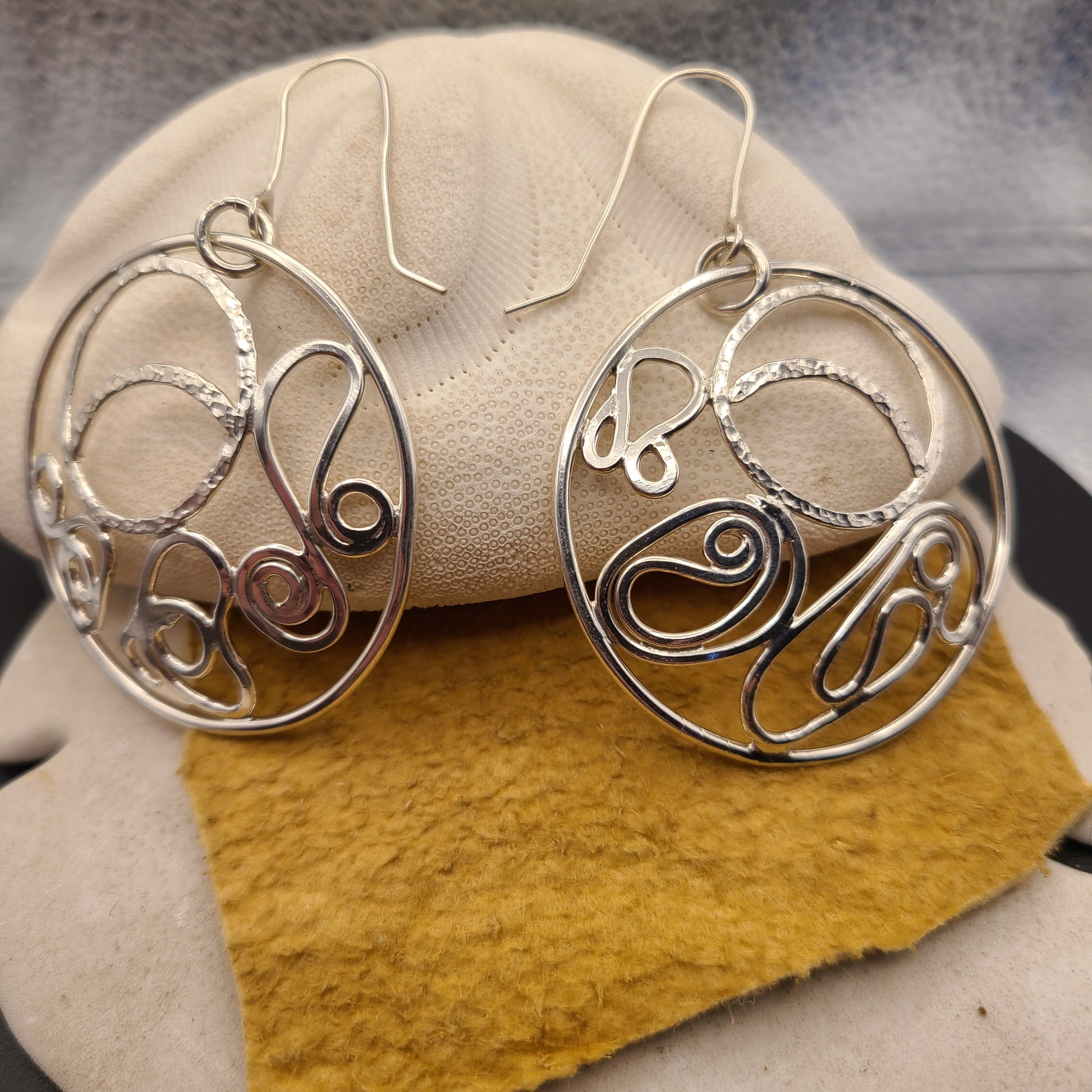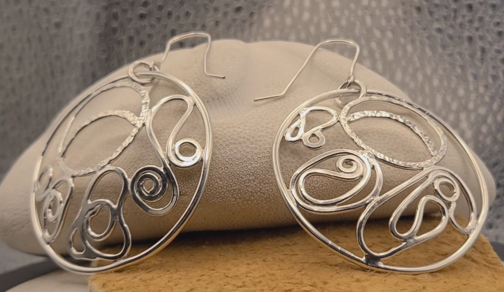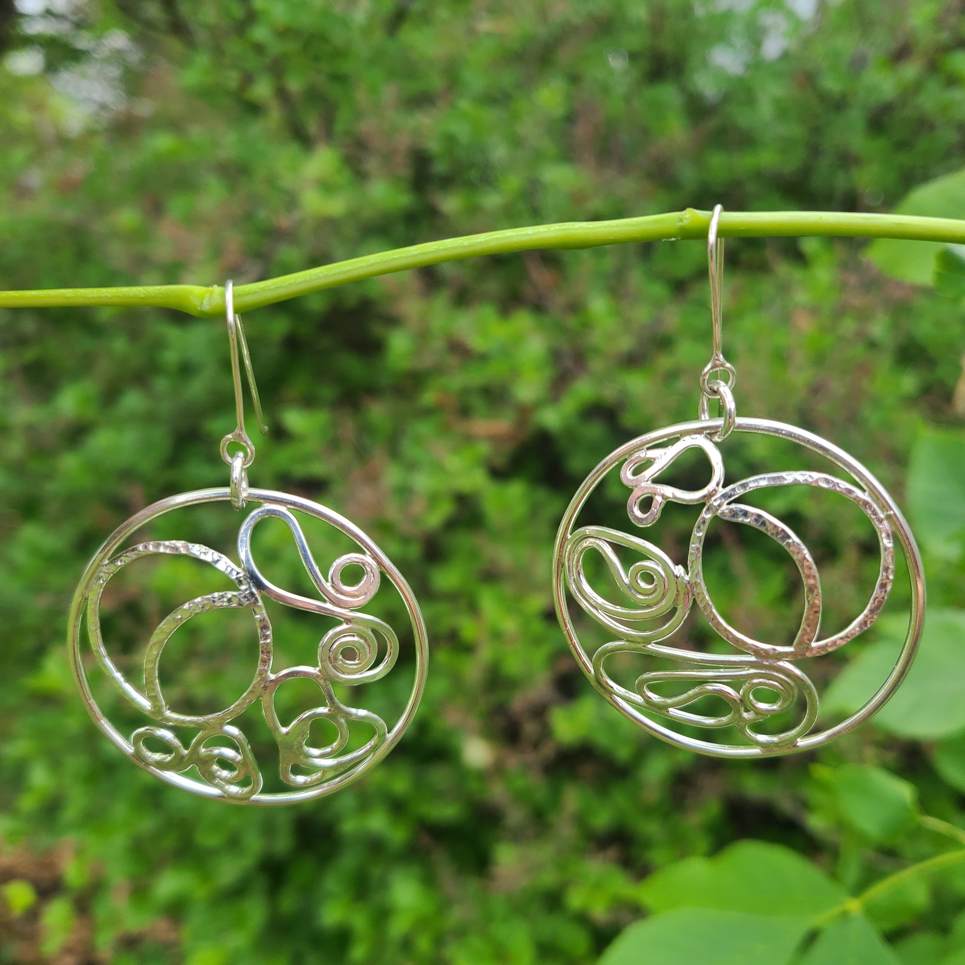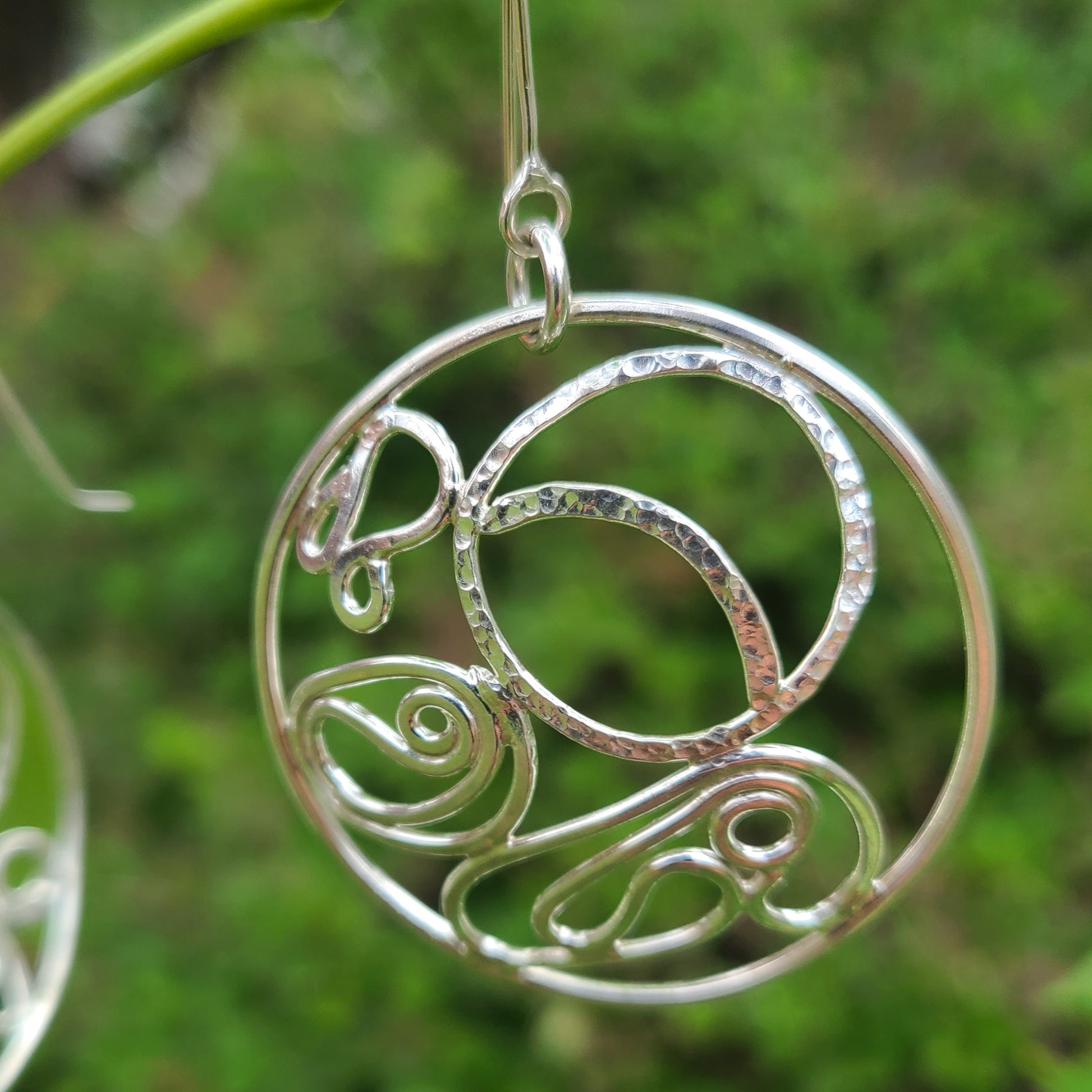 These sterling silver earrings depict moons. I enjoy working in this style as it allows for the construction of larger earrings while keeping weight reasonable.